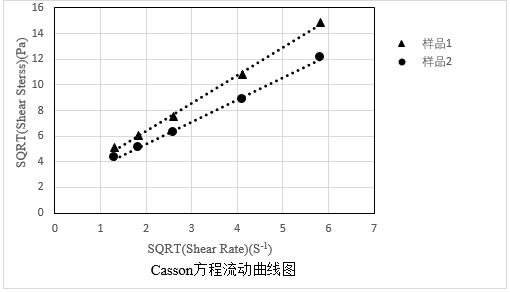 大量研究和实践表明,融化的巧克力浆料的流动规律符合Casson方程。在巧克力的粘度测量中,通常使用Casson 模型描述其流动行为,确定塑性粘度和屈服应力。通过粘度测量数据,绘制两种巧克力的流动曲线图,并计算其塑性粘度,屈服应力以及线性拟合相关系数,分析结果如下所示: