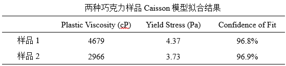 两种巧克力样品的流动规律均符合Casson方程,线性拟合相关系数均大于95%。屈服应力分别为4.37 Pa,3.73 Pa;塑性粘度分别为4679 cP,2966 cP。屈服应力是决定巧克力制品储存和涂抹性能的重要流变学参数,塑性粘度则反映了巧克力浆料的流动性能。而这,恰恰是巧克力粘度表征的意义所在。