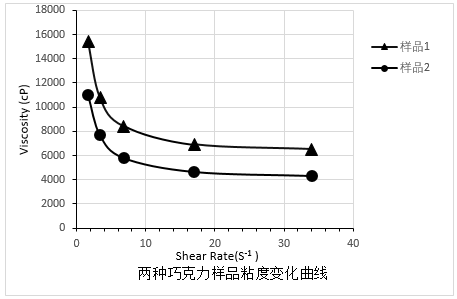 我们使用DV2THA粘度计配套SSA小量样品适配器测量两种巧克力的表观粘度,进而分析其独特的流变学特性。