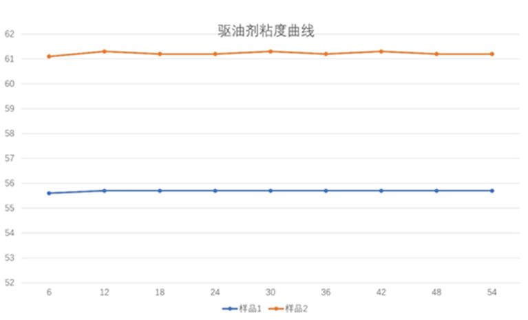 通过对比发现,两个样品的粘度值都非常稳定。一般的粘度测量中,开始测量的数据会比较不稳定,经过一段时间的测量,数据才会比较稳定。可以看出样品1的粘度值大约在55.8cP左右;而样品2的粘度值大约在61cP左右,样品2的粘度值明显要高于样品1。因此,两款驱油剂应有针对性地适用于相对应粘度的原油产品。
